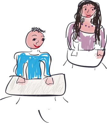Eva sitzt _________ Marko.